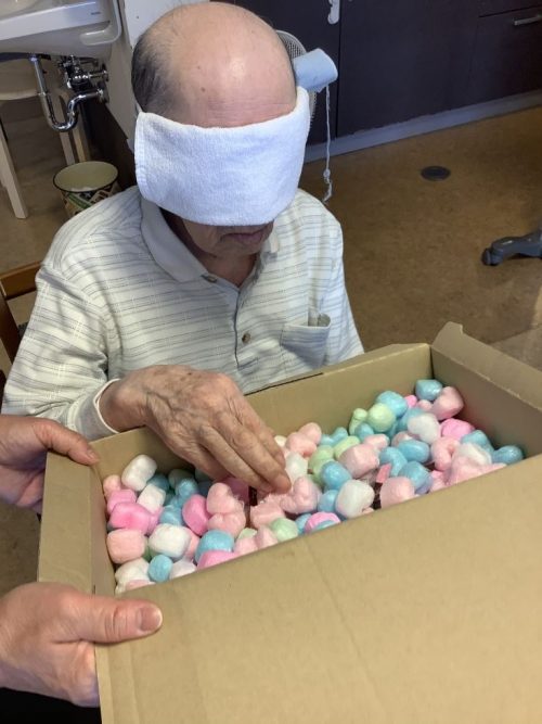 おやつ取りゲーム。目隠しをして手探りでおやつ探し。楽しみながら頂きました。
