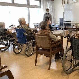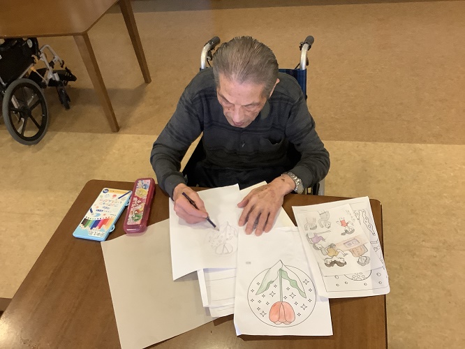 梅雨入り前の天気の良い日。散歩や体操、塗り絵など。活動様々。