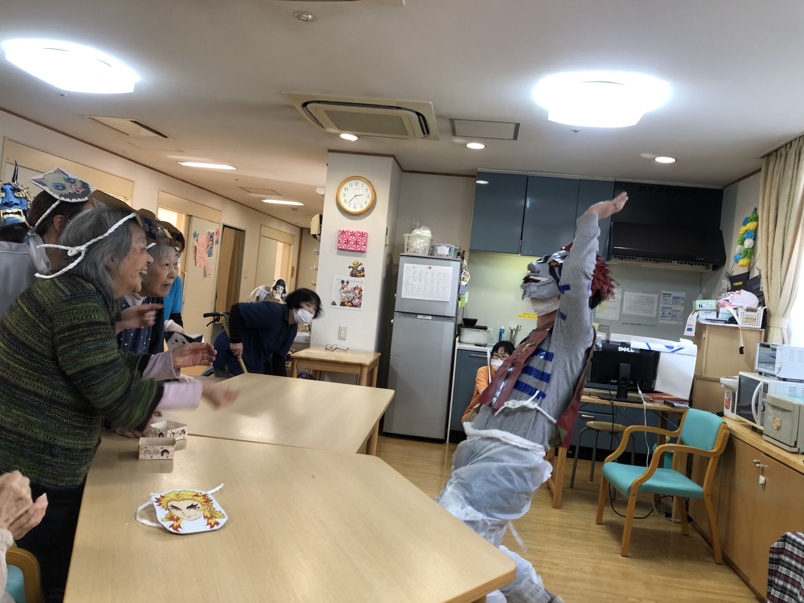 ご利用者様にも鬼滅の刃のキャラクターのお面をかぶっていただき(任意)、鬼たちに豆を投げて「滅殺」(鬼滅の刃で「鬼を退治する」の意味)しました。