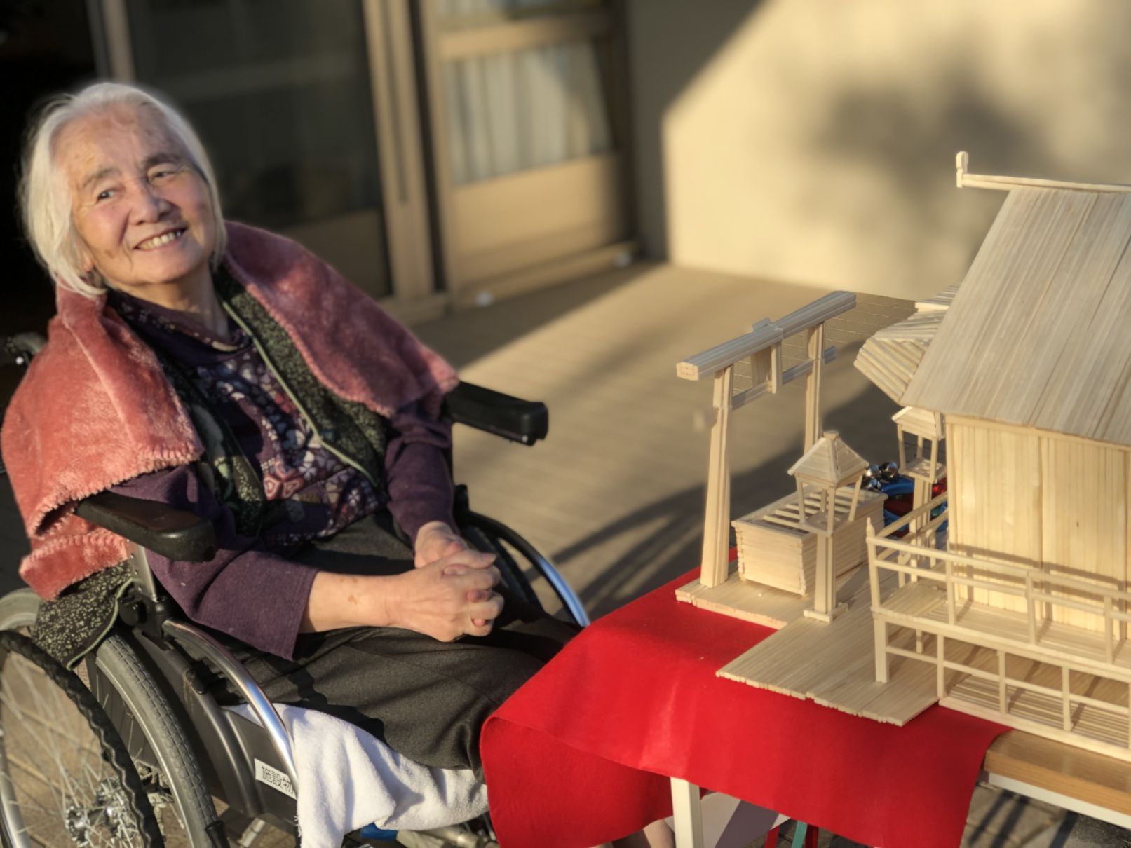 ご利益がありそうな富士山をバックにしたり、寒い日は屋内や居室でも参拝できるというどこにでも移動できる優れものの神社を職員さんが精魂込めて作ってくれました。