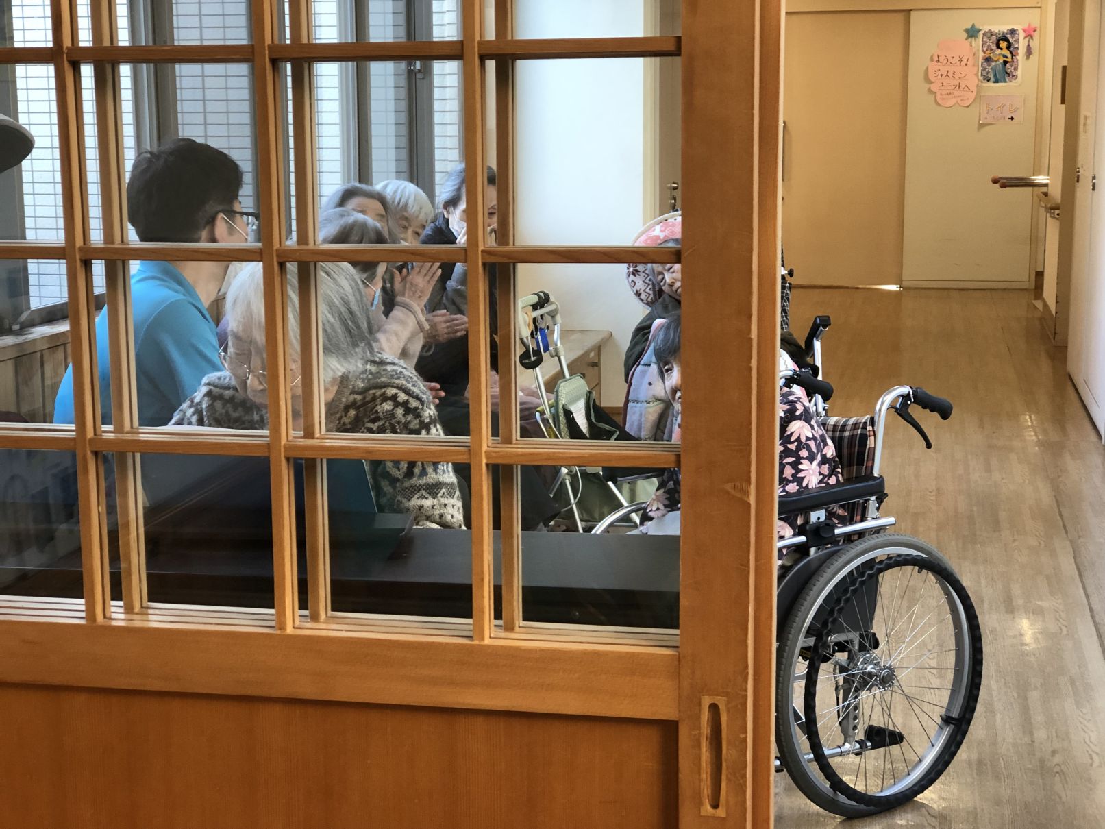 ぞくぞくとユニットのご利用者様が集まり、廊下の一角がすっかり音楽教室に。