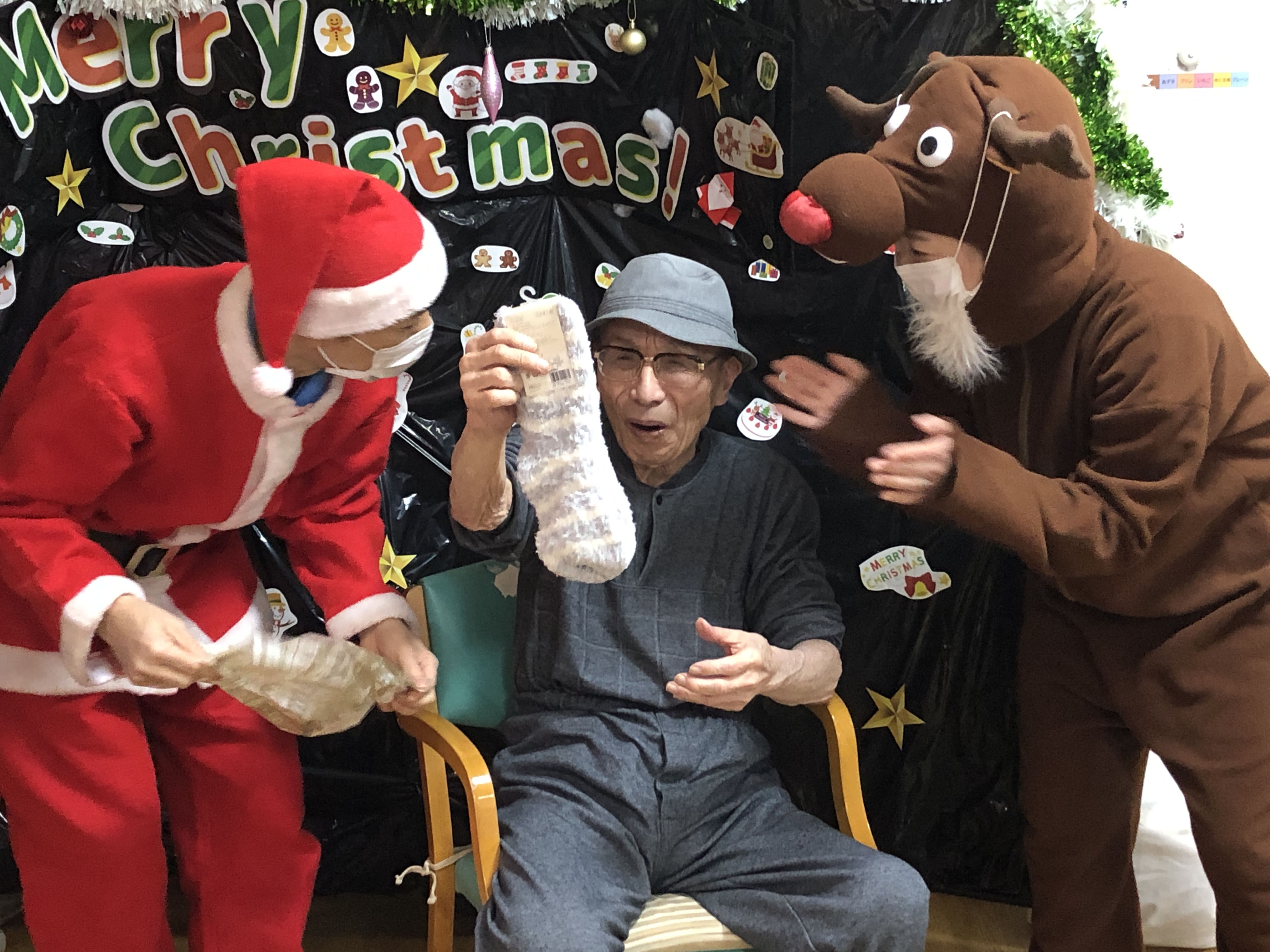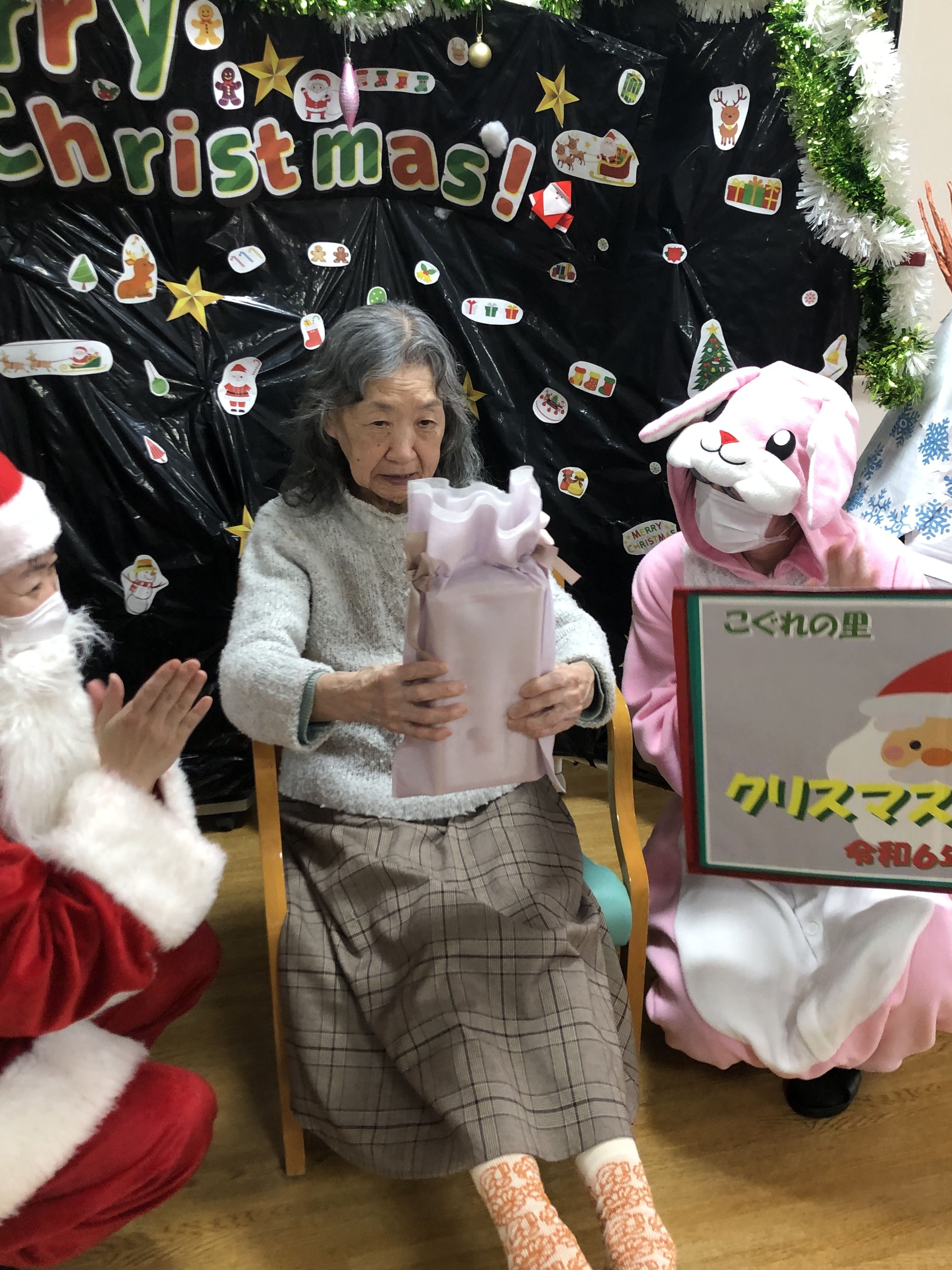 1階と2階それぞれのフロアでサンタとトナカイとうさぎに扮した職員がご利用者様のもとへ回ってプレゼントを渡しました。
