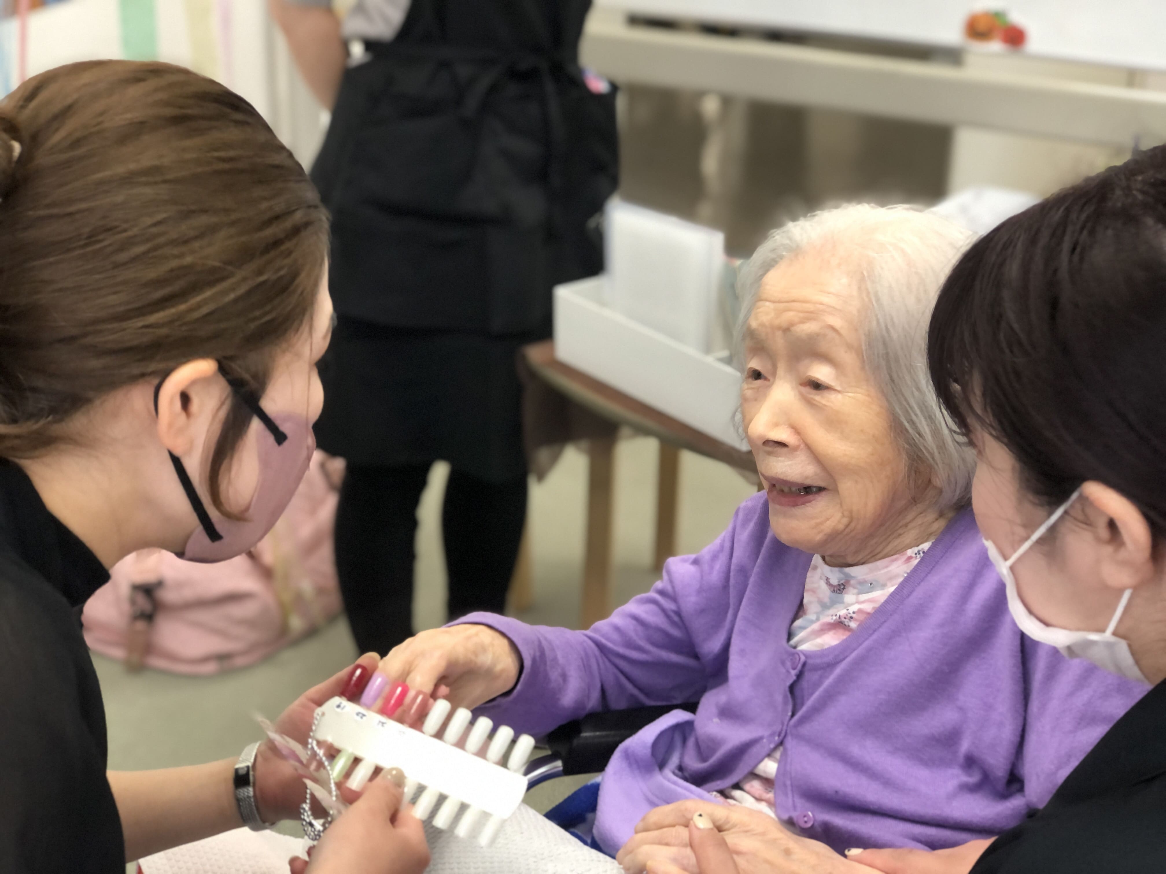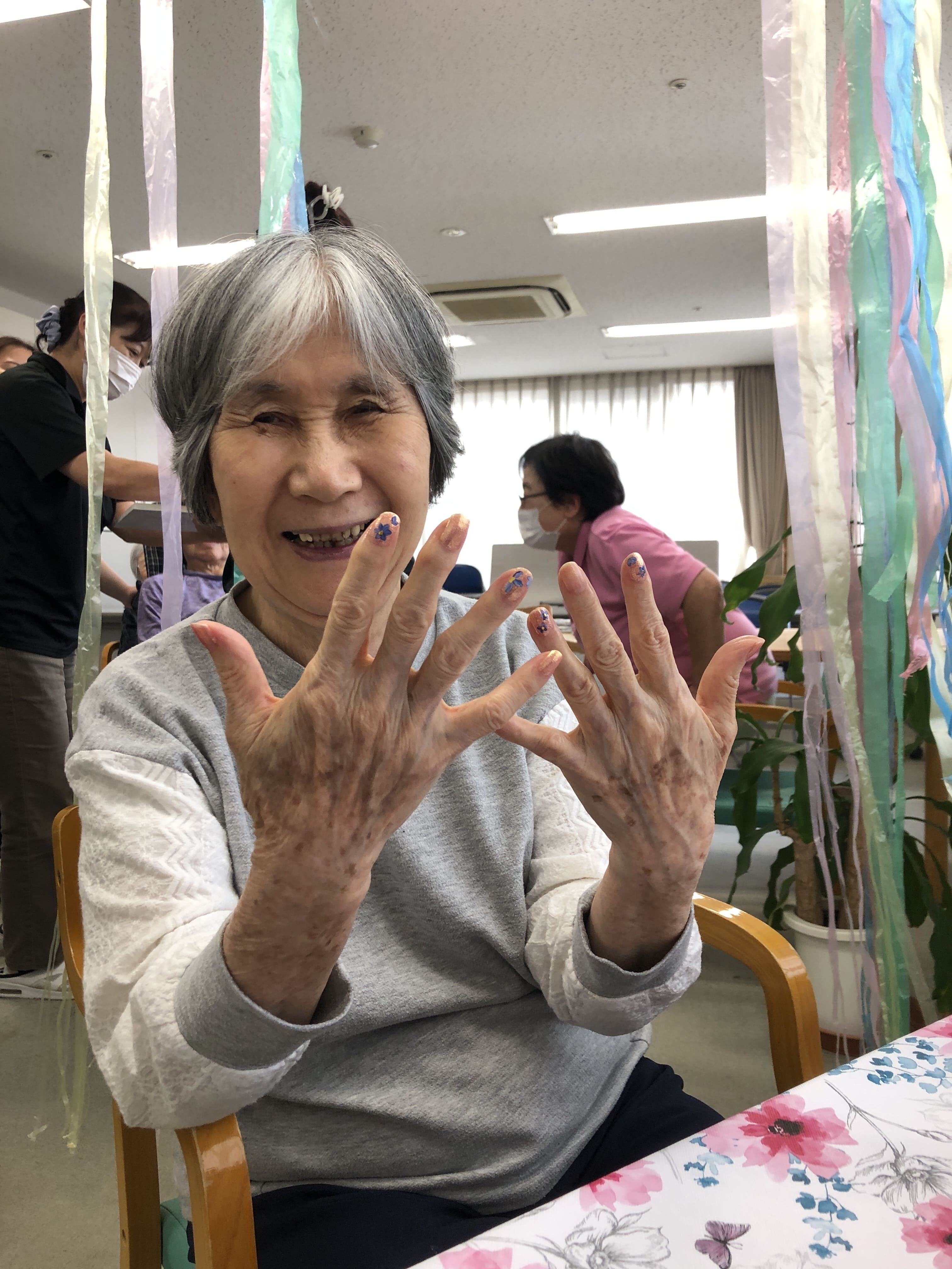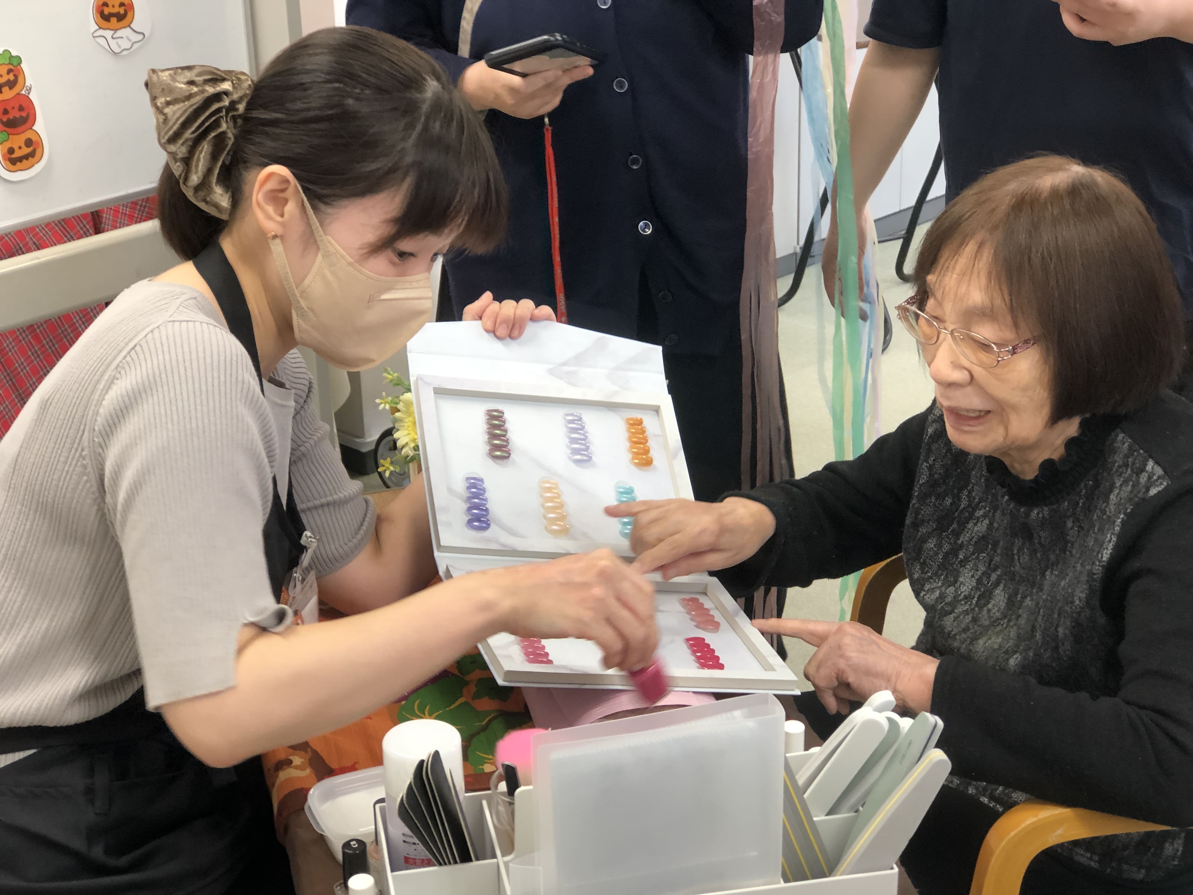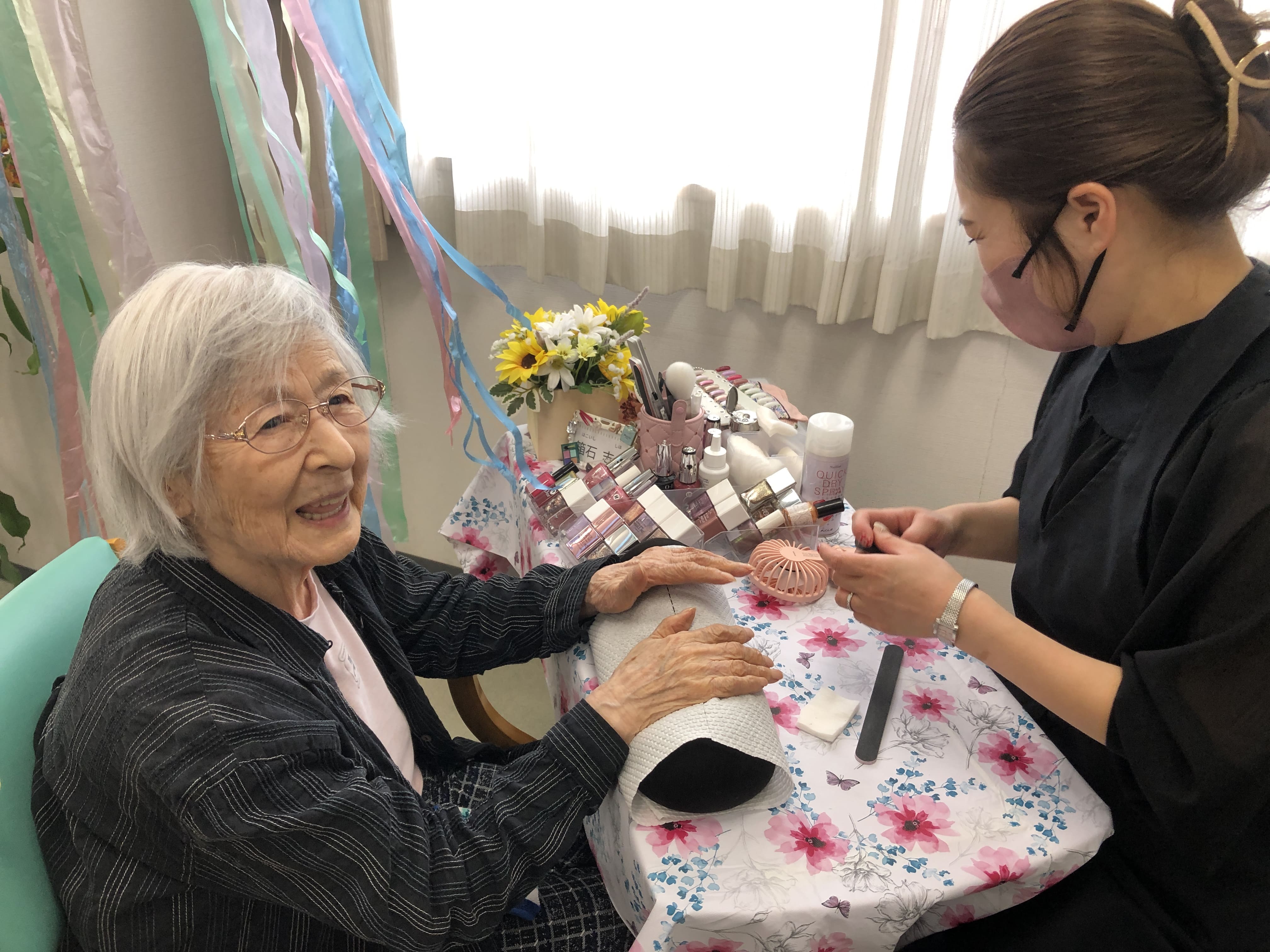 初めてのネイルサロン体験という方や以前からご自身で爪の手入れされている方等様々でしたが、ネイリストさんや職員と楽しく会話しながらのイベントになりました。塗った後のお互いの爪を見せ合うシーンも印象的でした。